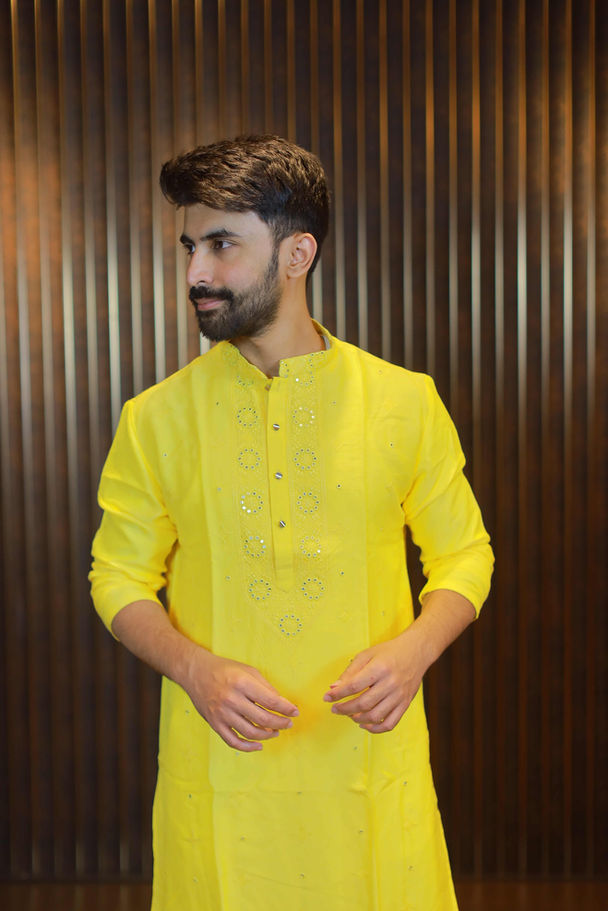 Yellow kurta with self thread & mirror Embroidery on the front & around the placket. Paired with Ivory Puna Pants.
